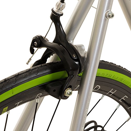 gebremst wird das Bike über Caliper Abfedern an beiden Rädern. Es fährt auf 700c x 23c schmalen Rennrad Altern und Leichtmetall Felgen.