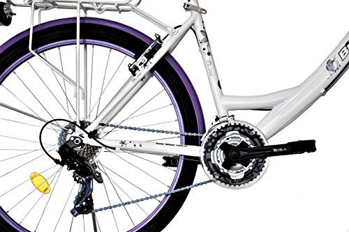 24 Steuer Cityrad Damen City Fahrrad 21 Gang Beschreibung: 24 ZOLL Cityfahrrad 21 GANG – Robuster, Lackierter Stahlrahmen in exzellentem Design Praktische Drehgriffschalter 21 Sunrun Gang – Shimano Gangschaltung Tourney-Leichtmetall Schutzbleche Stabile Bremsgriffe mit Metallbremshebel- V-Brake Felgenbremse achtern – Leichtmetallfelgen und Hebel -Fahrrad Korb abnehmbar- Praktischer Seitenständer – Gepäckträger Rahmenhöhe: 34cm , Von Boden bis Sattel: 70 cm , Farbe: Weiss-Lila – LED Beleuchtung STVO (vorne und achtern)-Neuware & OVP Fahrrad ist 85 % vormontiert. Sie bekommen das Fahrrad im Original Karton. Das Fahrrad muss aufgebaut werden. Falls Sie bisher noch keins Aufgebaut haben, erkennen lassen wir Ihnen das Fahrrad einer Fachkundigen Person aufbauen zulassen. Bitte würdigen Sie bei den Pedalen auf Rechts und Linksgewinde. Die In die Eisen steigen müssen vor der Fahrt eingestellt werden. Bitte vor der ersten Fahrt aufgebraucht schrauben anziehen. Übliche Wartungen sollten durchgeführt werden als z.b.: ölen der Kette, Reifenluft / In die Eisen steigen abklären etc.