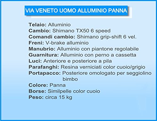H 50 (fur hohe 160 cm – 170 cm) H 54 (fur hohe 171 cm – 182 cm) H 58 (fur hohe 183 cm ebenso uber) Rahmen Leichtmetall, Gandshaltung Shimano TX50 6 speed Ballast ca. 15 kg, Shalthebel Shimano grip shift 6 speed, Bremse V brake aluminium, Lenkstange aluminium adjustable, Kettenradgarnitur aluminium, licht vorder ebenso hintere batteriebetrieben, Hintere gepacktrager gerechtfertigt fur Kindersitz, Tasche setlich braun setlich leder